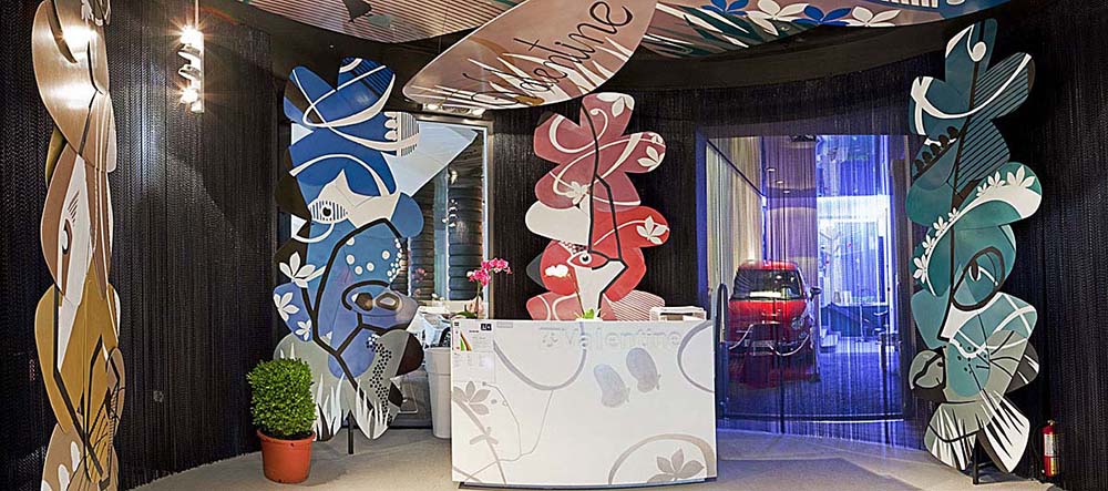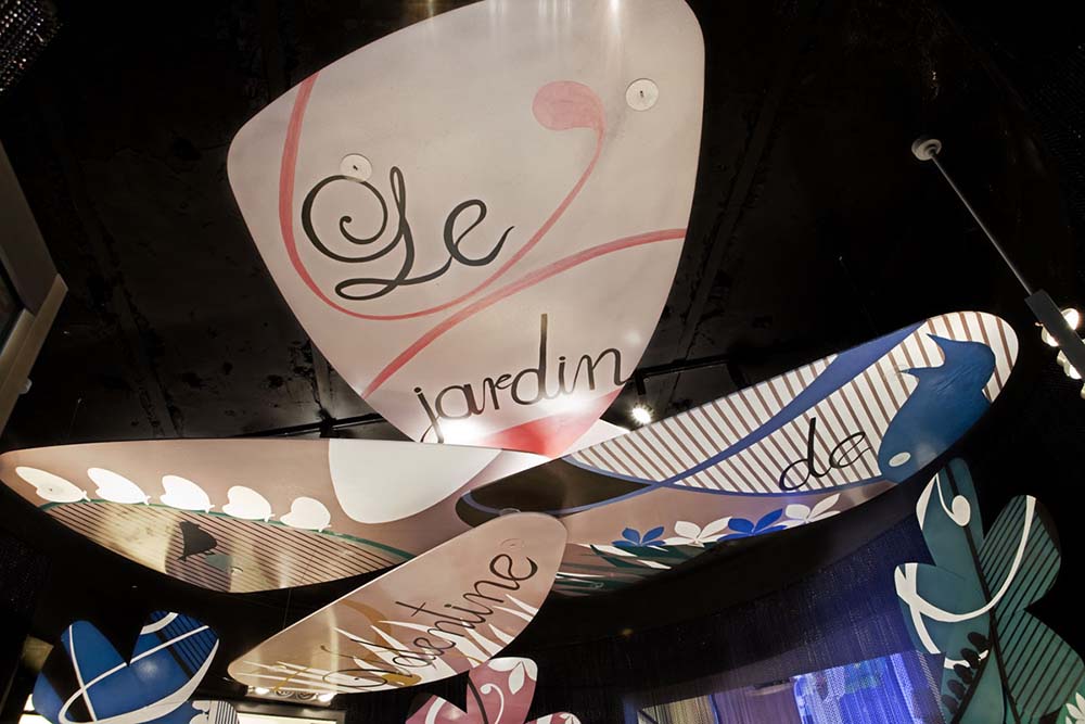 En “Le Jardin de Valentine” hay una explosión de color. Encontramos figuras exentas que nacen del suelo como tallos de flores. Grandes pétalos se desplazan por el techo a diferentes niveles. El conjunto recrea, a través de una interpretación gráfica, plantas y animales que nos observan y nos acompañan al acceso de Casa Decor. Toda una escenografía de naturaleza y colores vibrantes que se reflejan a través de la luz.